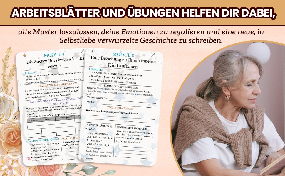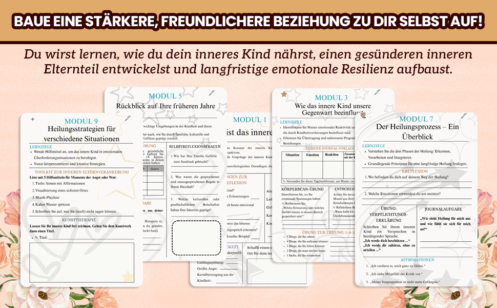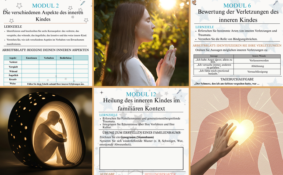 Jedes Modul begleitet Sie behutsam Schritt für Schritt und bietet Ihnen Einsicht und Struktur bei der Erforschung von Verlassenheitsverletzungen, emotionalen Auslösern, Bindungstraumata und vielem mehr. Auf diesen Seiten lernen Sie, eine nährende Beziehung zu Ihrem Inneren Kind aufzubauen, Ihren Inneren Elternteil zu entwickeln und Ihre Lebensgeschichte mit Mitgefühl und Klarheit neu zu schreiben.